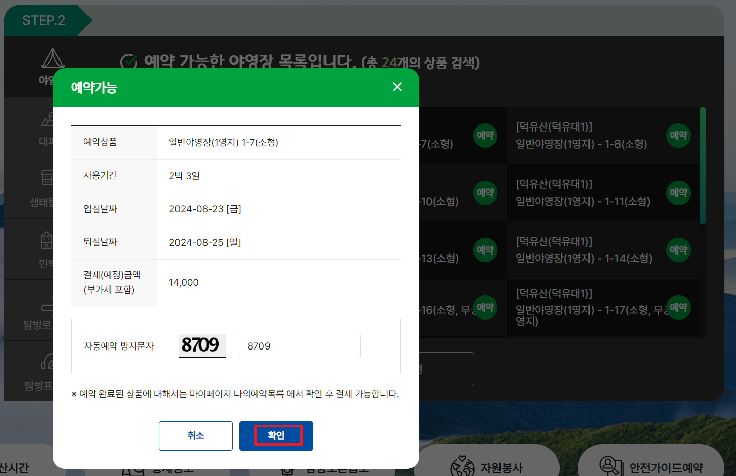 6. 확인 버튼을 누르면 가예약이 됩니다.