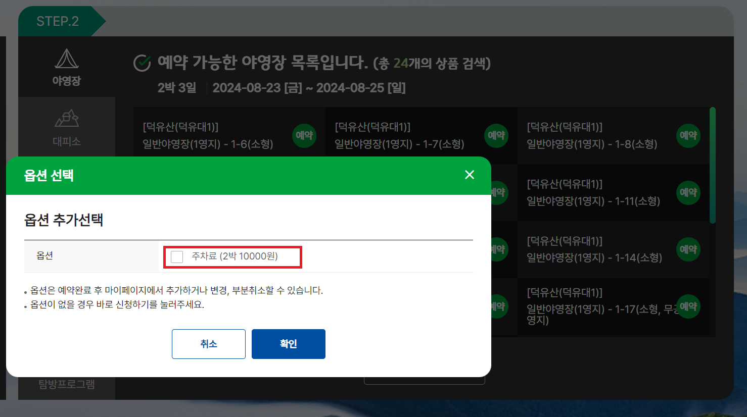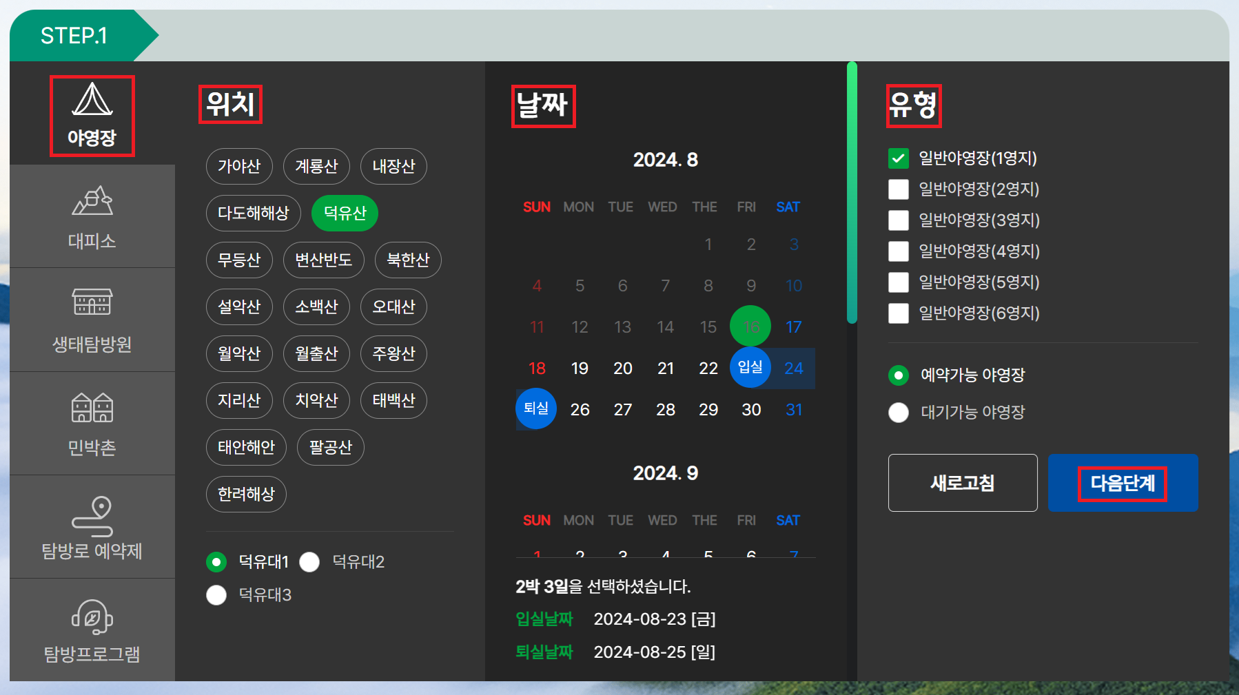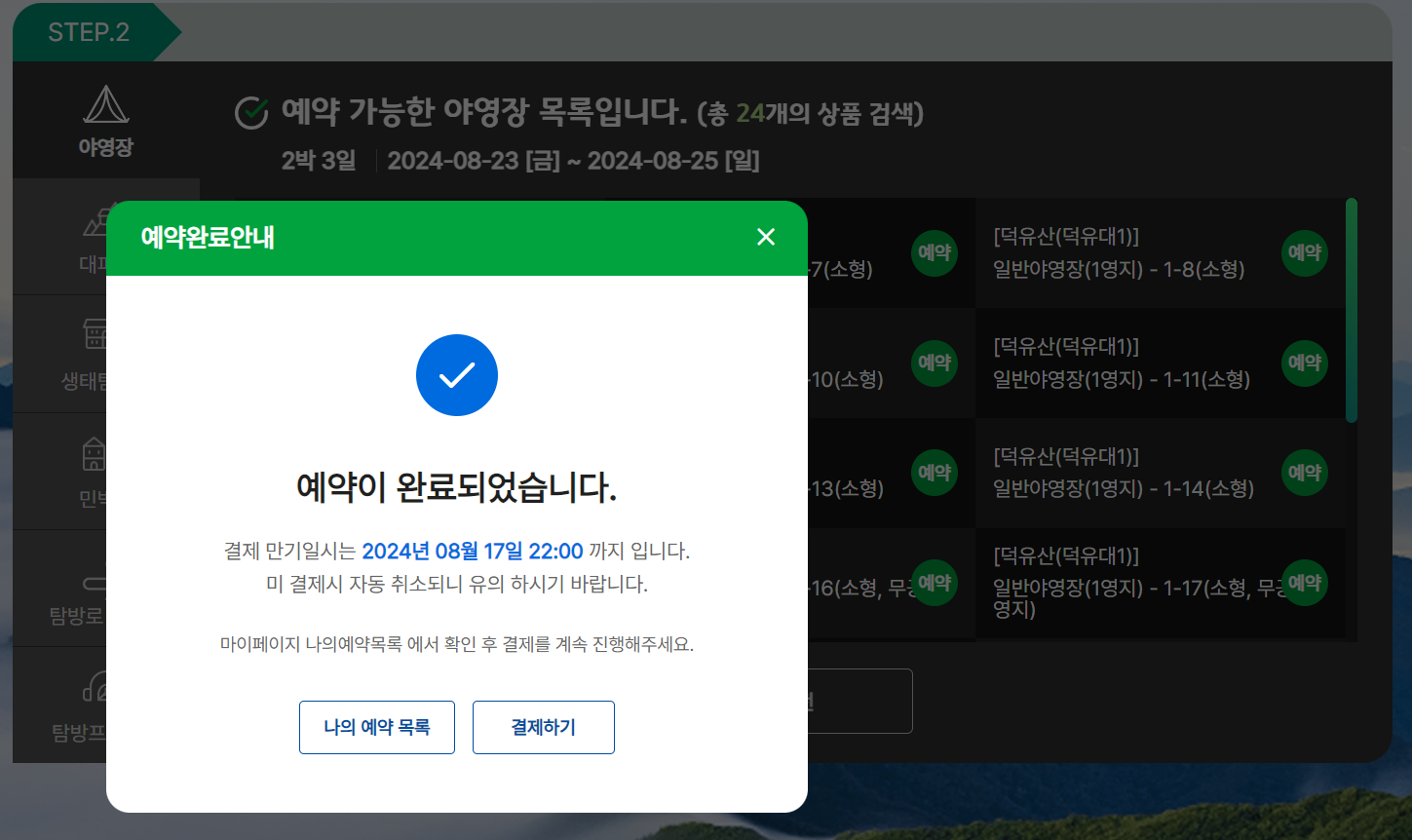 4. 다음단계 버튼을 클릭하면 예약 가능한 야영장 목록이 뜹니다. 원하는 야영장을 선택합니다.