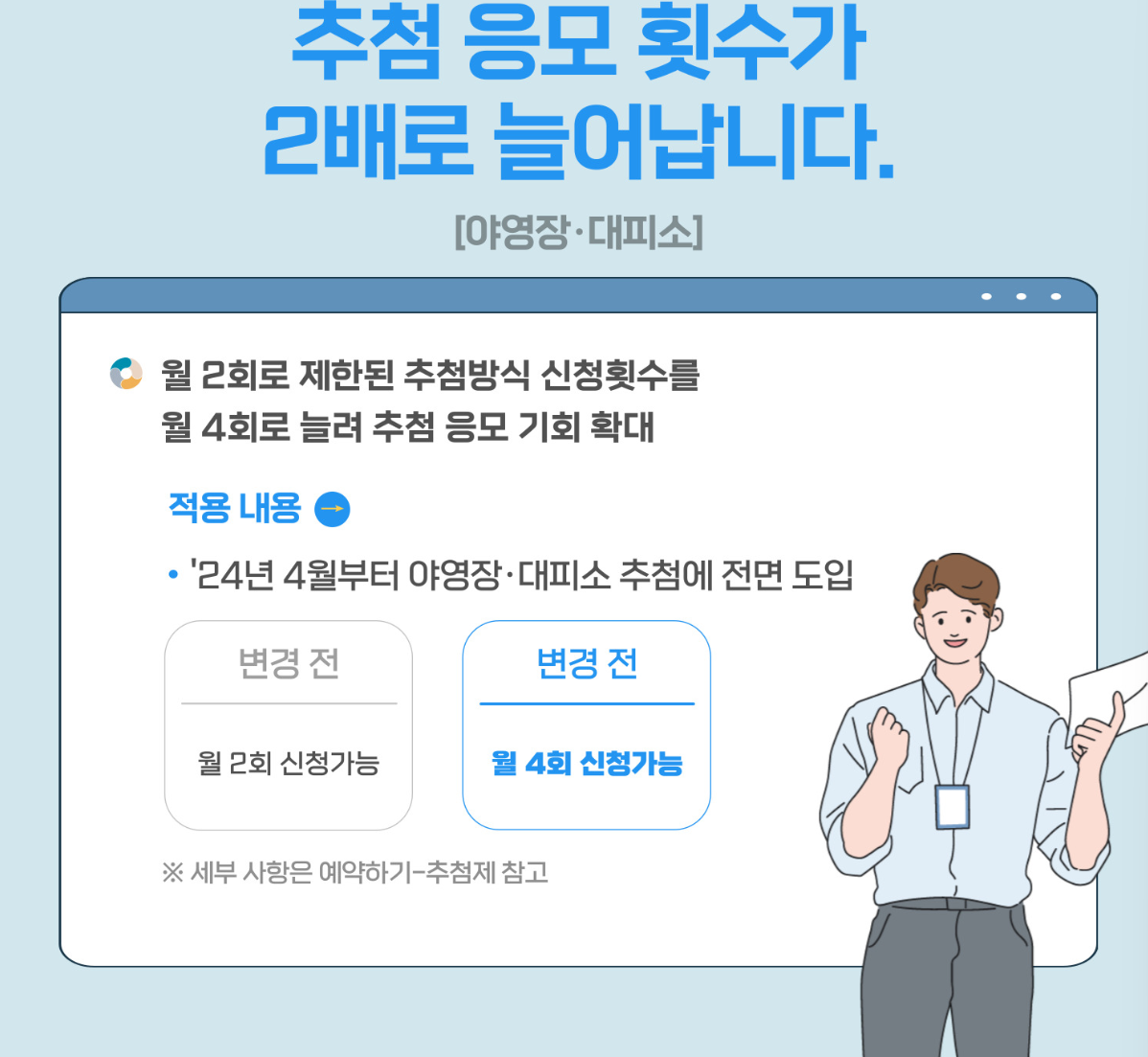 시설을 예약하는 방식이 4월부터 바뀌었습니다. 8월 접수 시에는 9~10월을 이용할 수 있습니다.