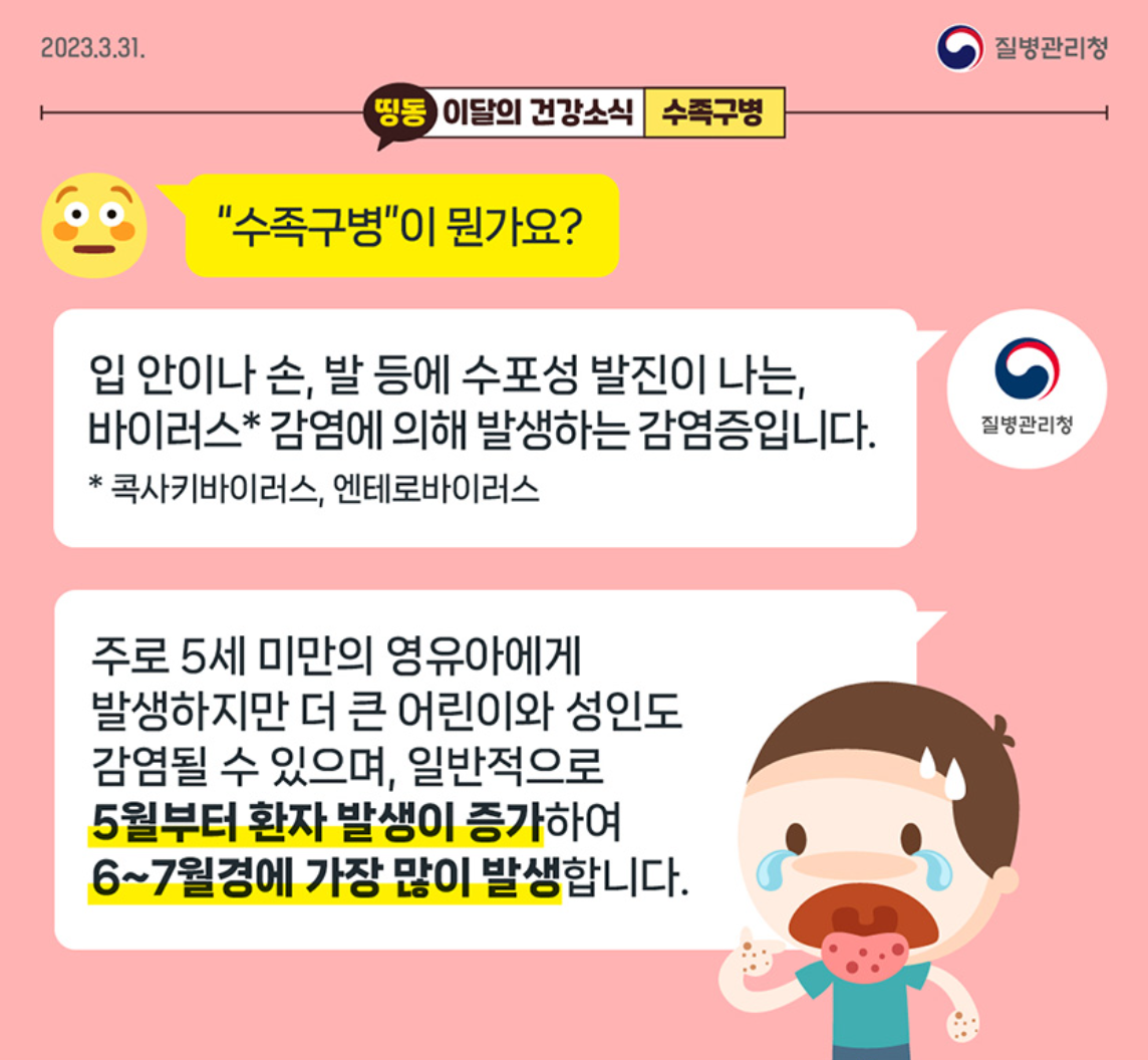수족구병은 손발입병이라고도 합니다. 자세한 내용은 아래 질병관리청에서 확인해보시기 바랍니다.