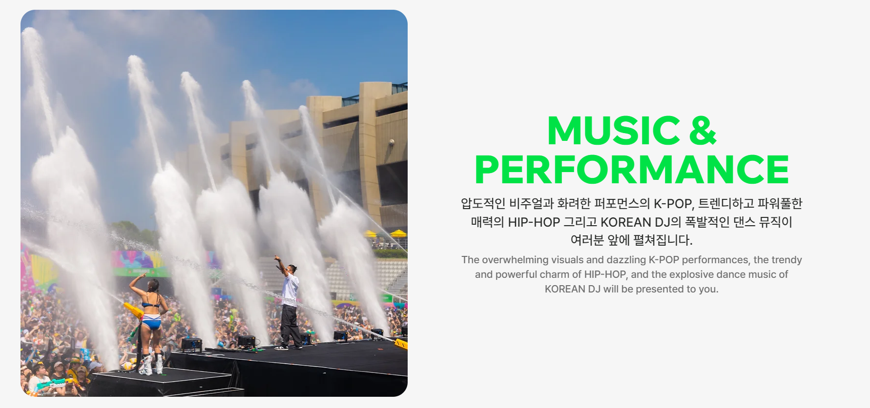 - 공연 관람할 분들은 스테이지 쪽 스탠딩 구역을, 물놀이와 워터파이팅을 즐기실 분들은 스탠딩 바깥쪽을 이용하세요.
