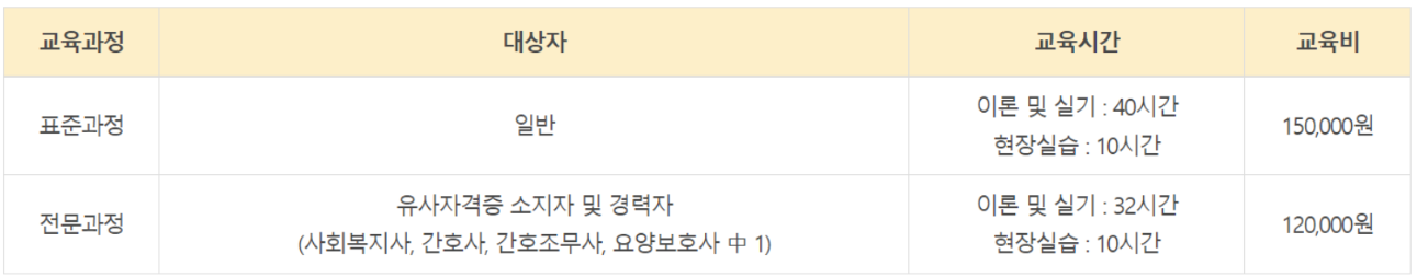 교육과정은 표준과정과 전문과정으로 나뉩니다. 여기서 전문과정은 노인요양보호사나 사회복지사와 같은 업무를 했던 사람을 대상으로 진행됩니다. 표준과정은 교육비가 15만원, 전문과정은 교육비가 12만원입니다.