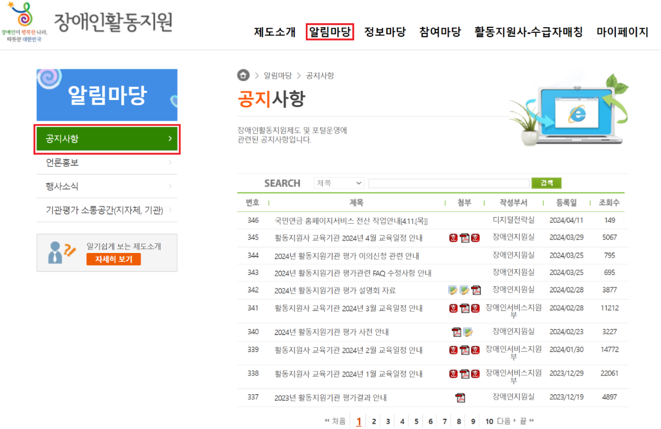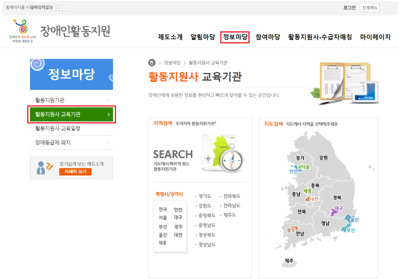 [ 홈페이지 접속 > 정보마당 > 활동지원사 교육기관 ] 순서대로 클릭해서 들어갑니다.