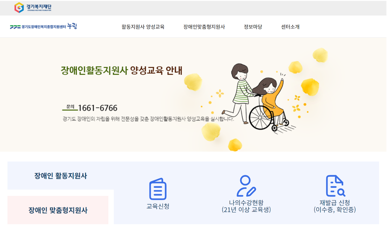 경기도 수원시에 위치한 교육기관을 예시로 보여드리겠습니다. 장애인 복지 종합 지원센터를 통해 활동지원사 양성교육에 대해 확인해보시기 바랍니다.