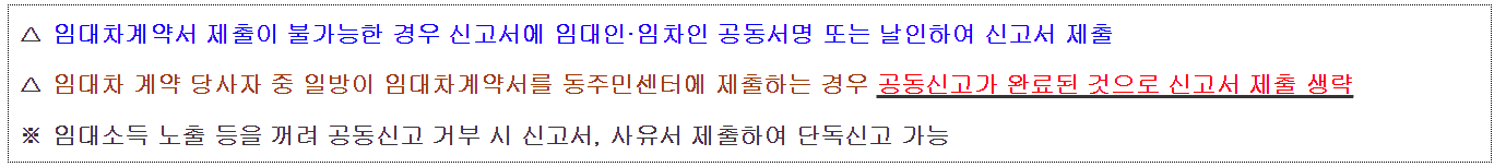공동으로 작성한 계약서가 없을 경우는 계약자 중 한 명이 계약금 입금내역 등 임대차 계약내용을 확인할 수 있는 서류와 함께 신고서를 작성하여 신고할 수 있습니다.