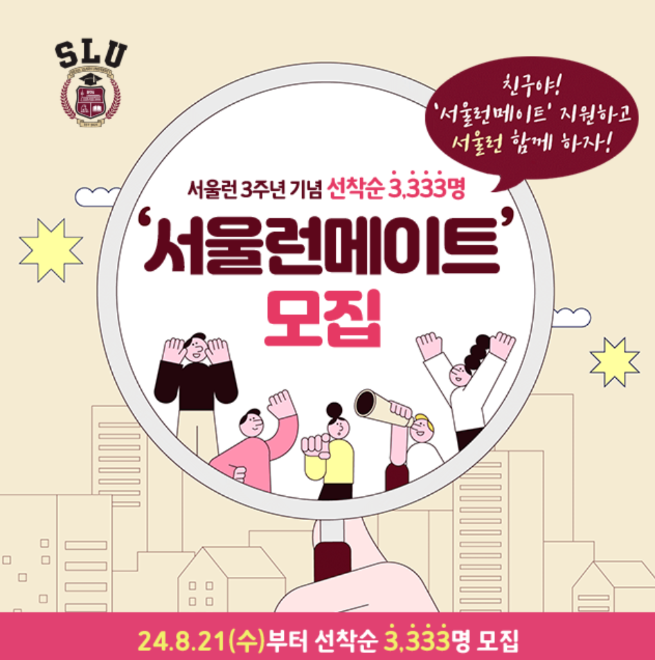 서울런은 소득 등 요건에 부합해야 이용할 수 있었지만, 이번에 [서울런메이트]는 서울런 3주년 기념으로 선착순 3,333명에게 8월 21일부터 서울런 서비스를 무료 체험할 수 있는 기회를 제공합니다.