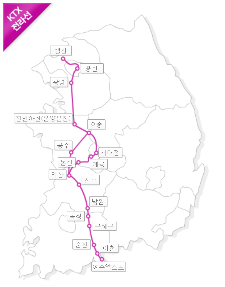 전라선은 서울 용산에서 여수까지 연결합니다. 서울에서 전주, 순천, 여수엑스포를 가시려면 전라선으로 예매하시면 됩니다.