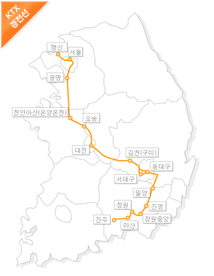 경부선은 서울에서 부산까지 연결합니다. KTX 전체 노선 중에 가장 많은 승객이 이용합니다. 서울에서 대전, 대구, 경주, 포항, 울산을 가시려면 경부선으로 예매하시면 됩니다.